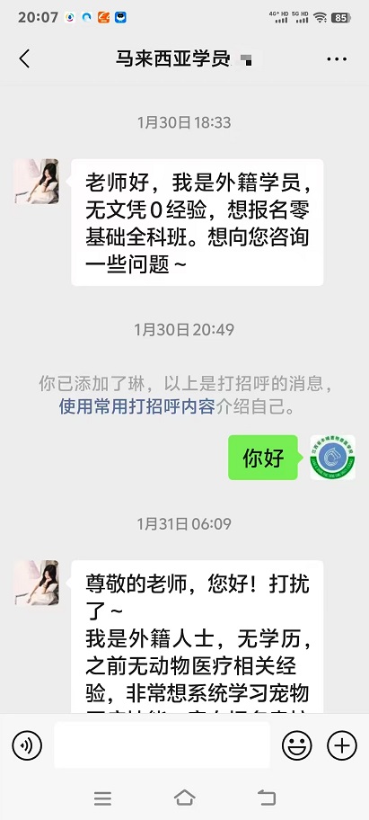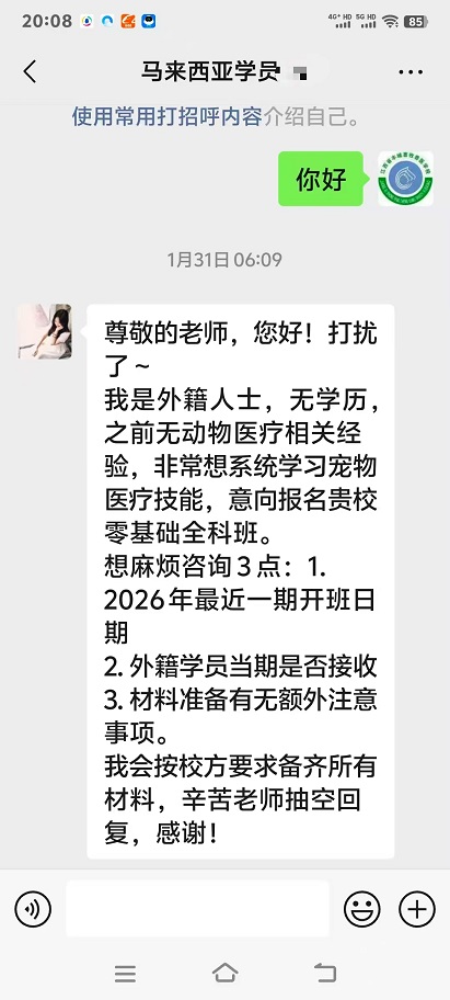深耕动物医疗领域,培养兽医实用人才。我校兽医培训经过数十年来的完善与发展,现已形成完整领先无可复制的培训教学体系。学员遍布各地,包括中国澳门同胞。2026年伊始,又收到来自马来西亚等外籍学员咨询报名我校宠物医生培训的学习事宜。“山不在高,有仙则名,水不在深,有龙则灵”,我们将不负众望,继续做优做精培训领域,普及推广案例教学、情景教学,以实操为主,技能为王的培训特色在行业里做出自己的品牌。